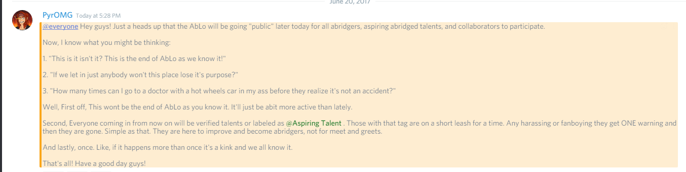 Abridgers' Lounge (Often shorten to AbLo) is a Discord Server and a Youtube that was created by a majority of the former mods of the AbCom server after a difference of opinions with the server owner. AbLo serves as a place for abridge creators to communicate with other creators, recruit voice actors, receive or give critique and promote their videos.